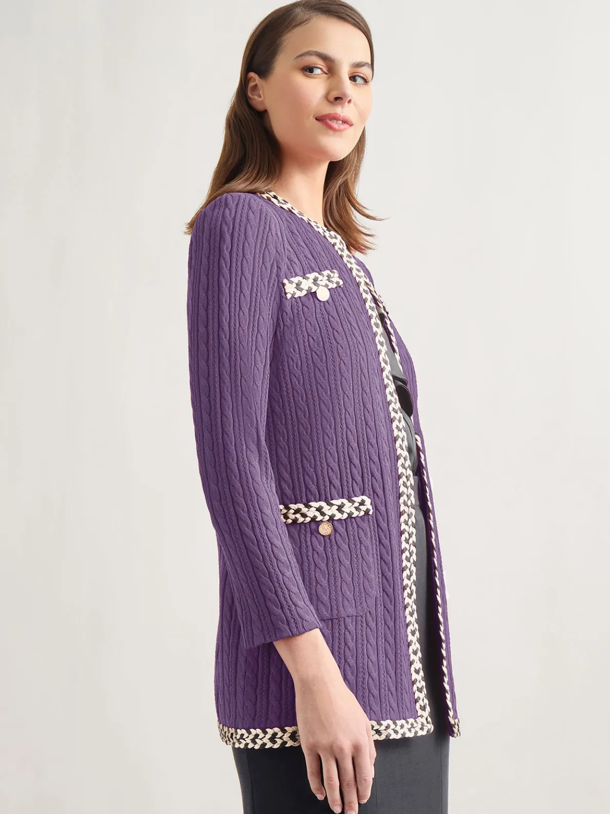 Traditional meets modern in the fascinating design of our Jewel Neck Contrast Trim Cable Knit Jacket. The classic tweed knit is enhanced with an Earthy rich color combination with braided trim along the collar, an open front, and pockets – both faux and functional. This sleek jacket flatters with a timeless heritage fit that offers a polished, tailored look. Pair it with matching tweed bottoms or sharp suiting separates for work or formal affairs.