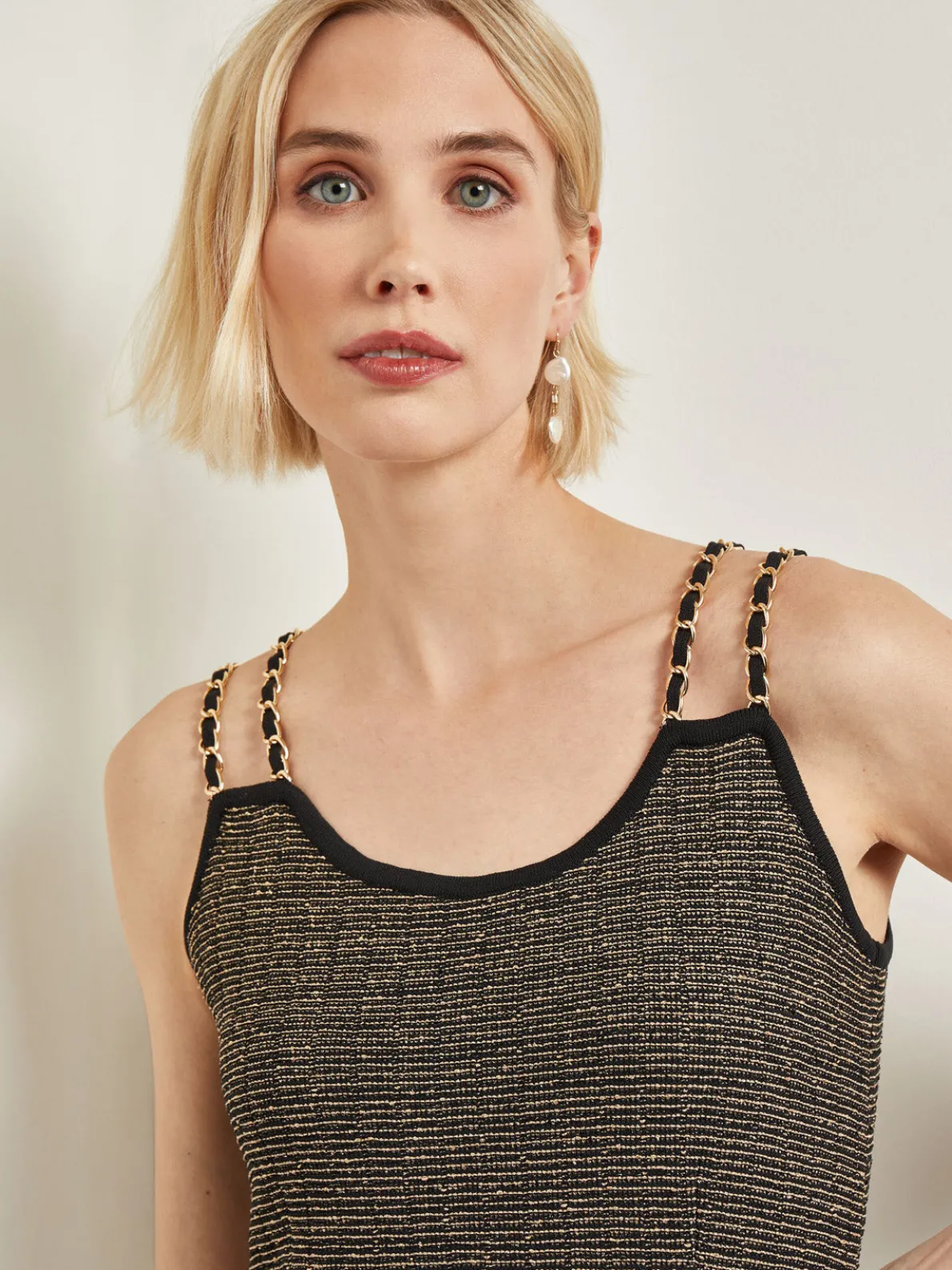 This stunning Curbed Chain Strap Mini Dress is the perfect occasion dress. This dress features a double chain strap and scoop neckline. Pair this with the matching jacket for a complete look destined for any cocktail parties and events.