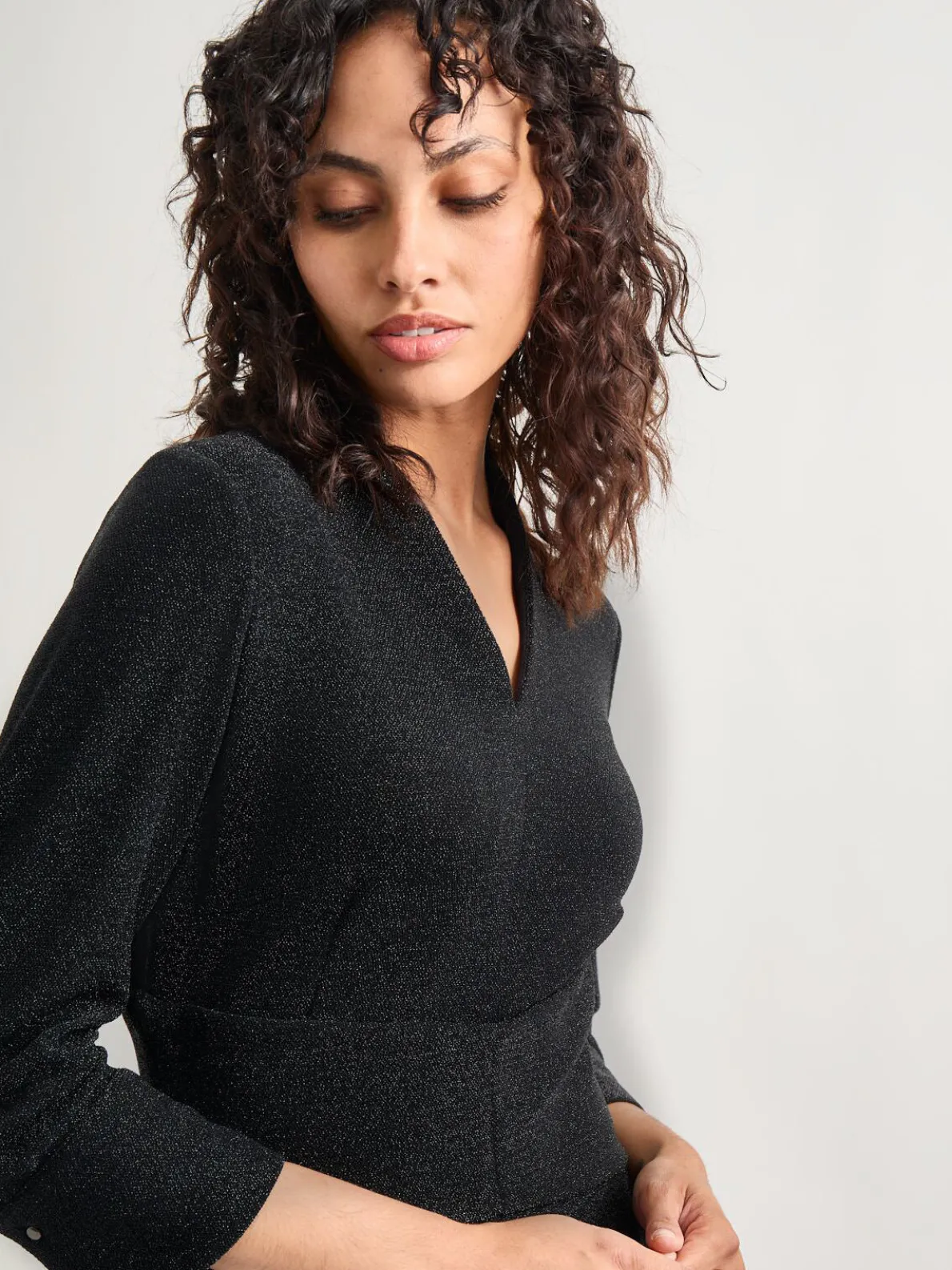 Our Fit-and-Flare Sparkle Woven Midi Dress is a dazzling piece – literally. This garment has lurex fibers sewn throughout, giving it a subtle sheen when you step into the light. This dress features bracelet length cuff sleeves and a v-neck neckline. Wear this to your next event to dazzle.
