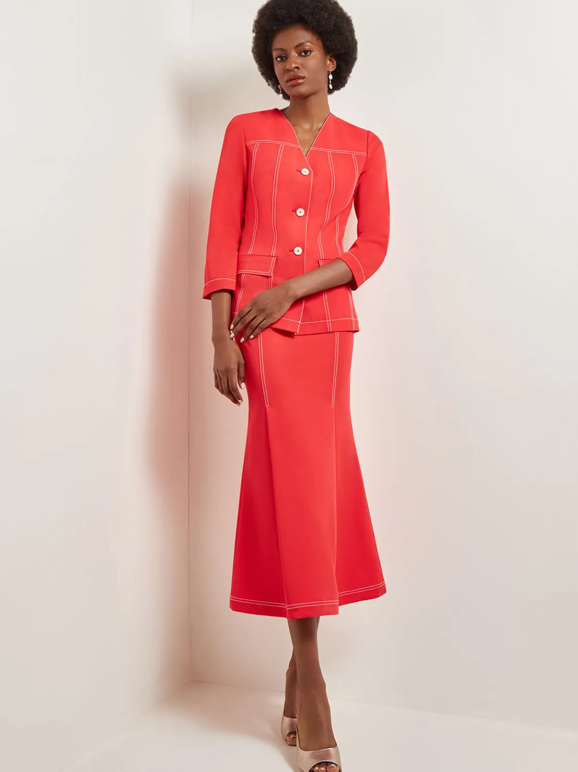 Our Modern Fit Jacket boasts a chic V-neck design complemented by the sharp contrast of white stitching on the Radiant Pink body. Pair it with our matching Tailored Midi Skirt for a complete contemporary ensemble, or opt for more neutral bottoms to pare back the look.