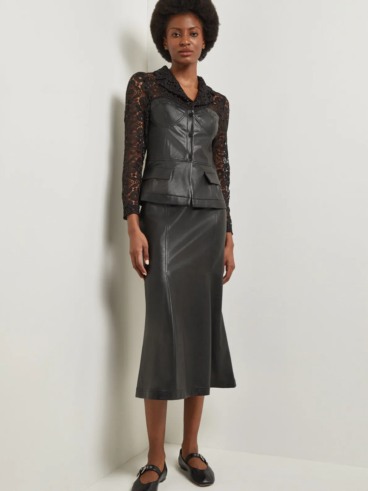 Our Lace & Vegan Leather Jacket was created for the bold. The corset bodice offers full coverage to your torso while the inset lace creates texture through the garment. With Faux Pockets and a Notch Lapel Collar, not a feature was ignored. Wear this with the matching trumpet vegan leather skirt for a completed outfit.