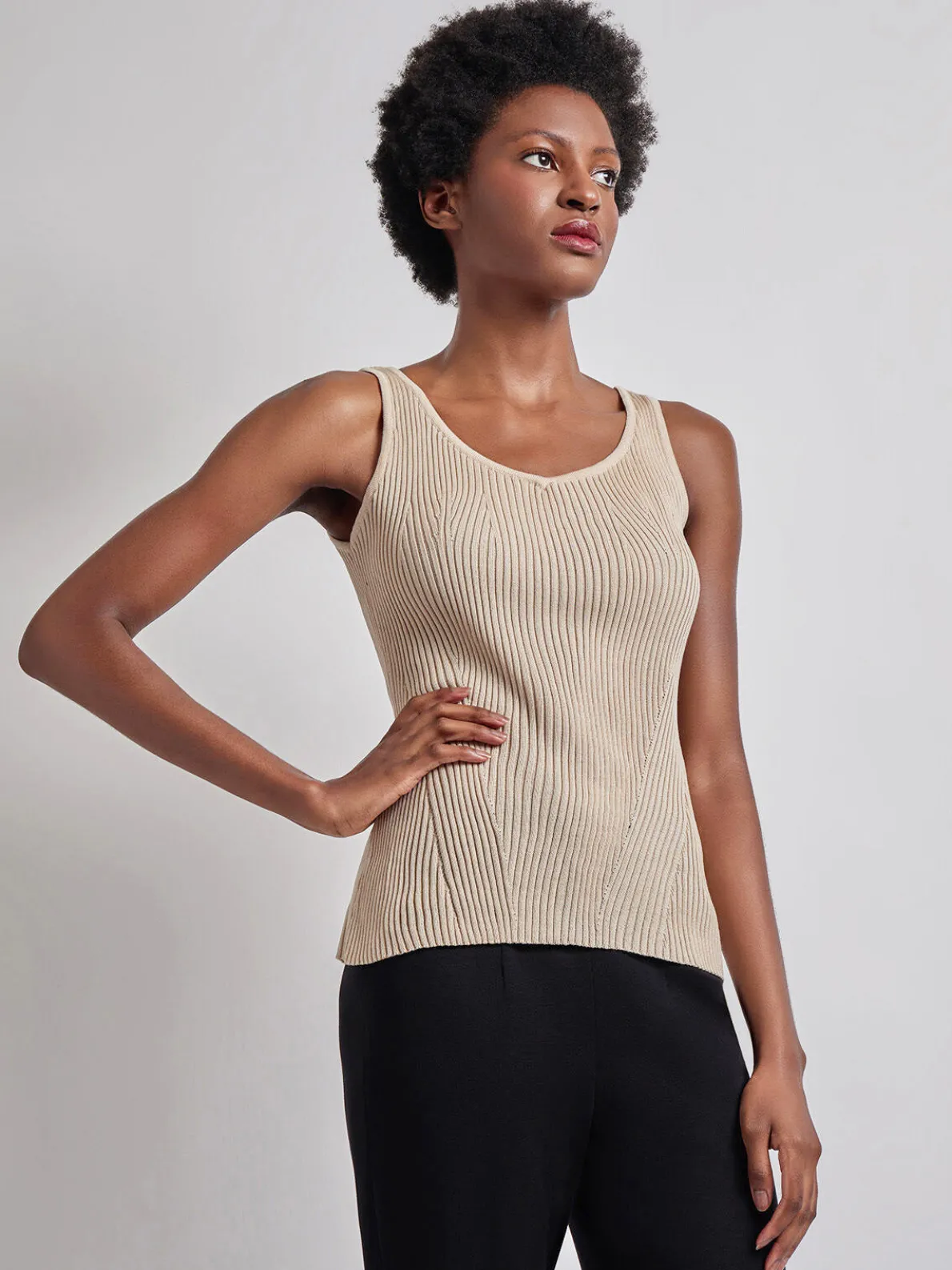 Try our new take on a timeless classic. This tank features a ribbed knit and V-neckline. The ribbed knit is stitched in a way that gives the garment a subtle shape to flatter any figure. This tank can be worn under one of our signature jackets or with a simple skirt on a hot day.