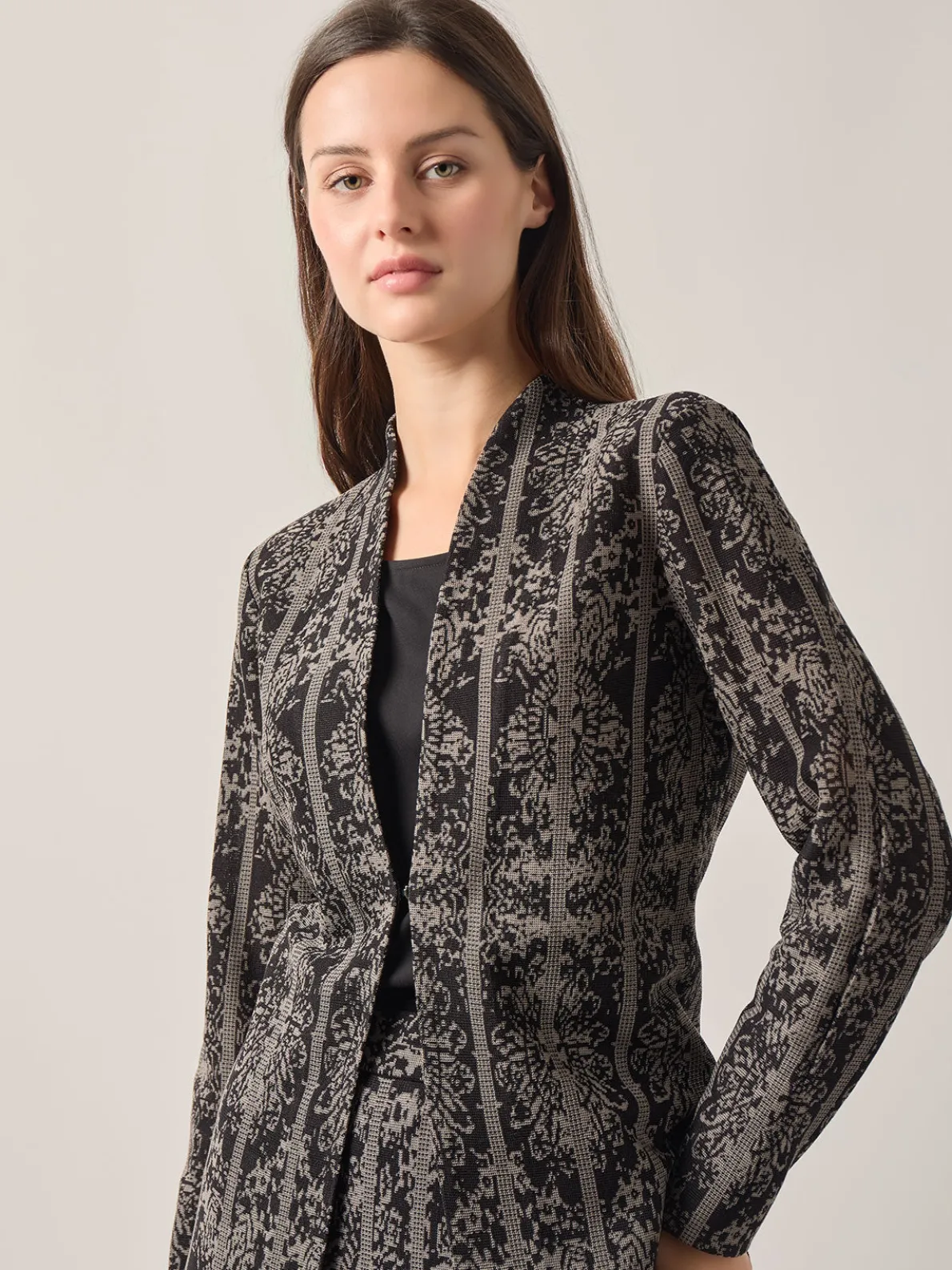 Our Two-Tone Jacquard Knit Jacket features a repeated damask pattern throughout the entire garment. This jacket is a lightweight piece, accompanied with a modified mandarin collar making this a unique garment that is perfect for fall weather. Pair this jacket back to the matching a-line maxi skirt or a pair of our best-selling straight leg knit pants for a more professional look.
